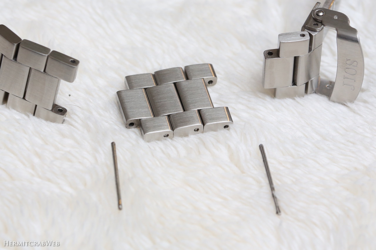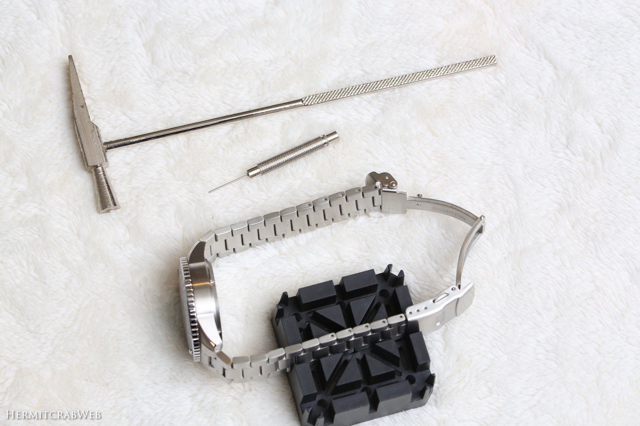 JIOS GMTのブレスは割りピン式なので、このようなピン抜き棒と小型ハンマー、専用の台を使います。