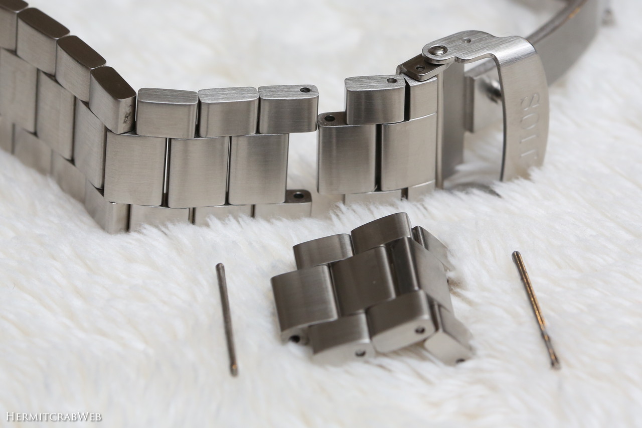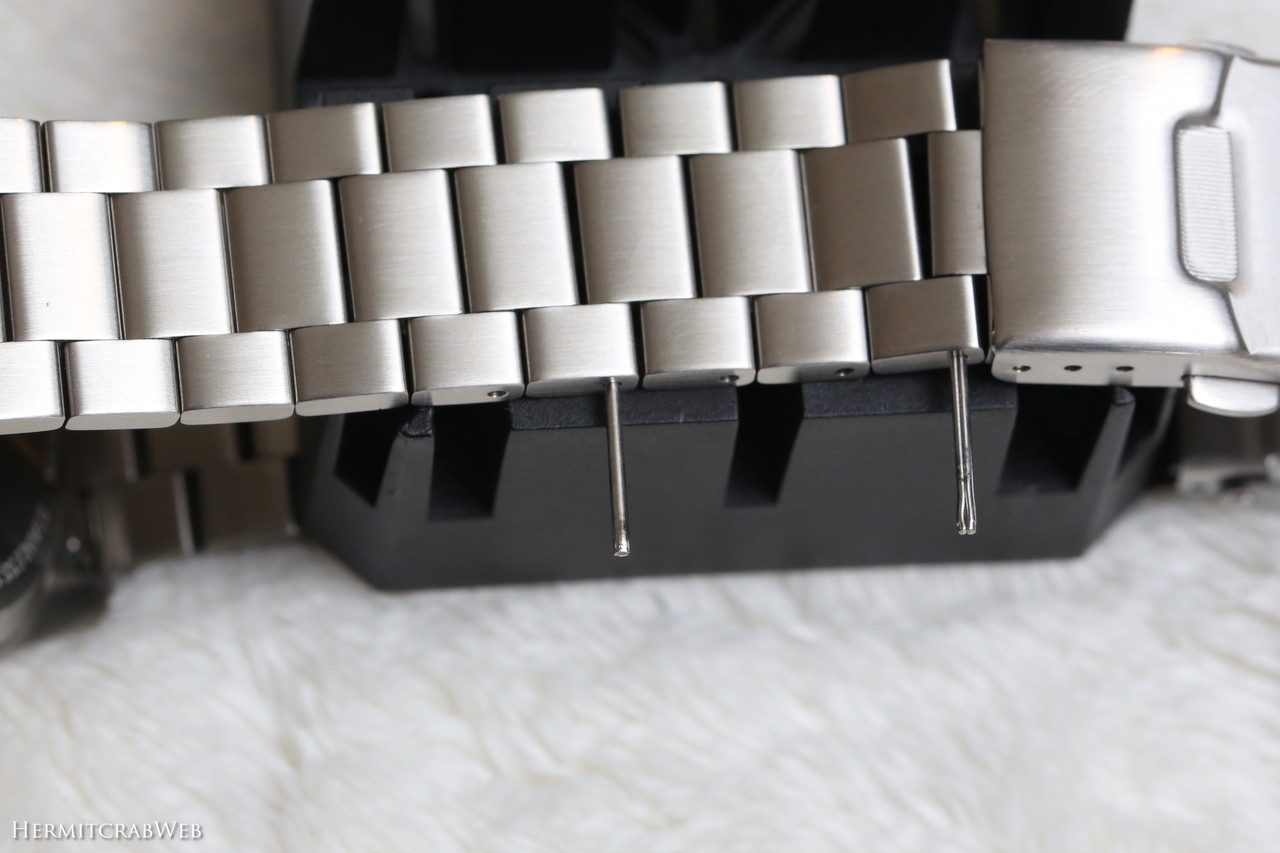 写真を取り忘れましたが、ブレスの内側には割りピンを抜く方向が分かる矢印が刻印されています。それに従ってピン抜き棒を打ち込みます。