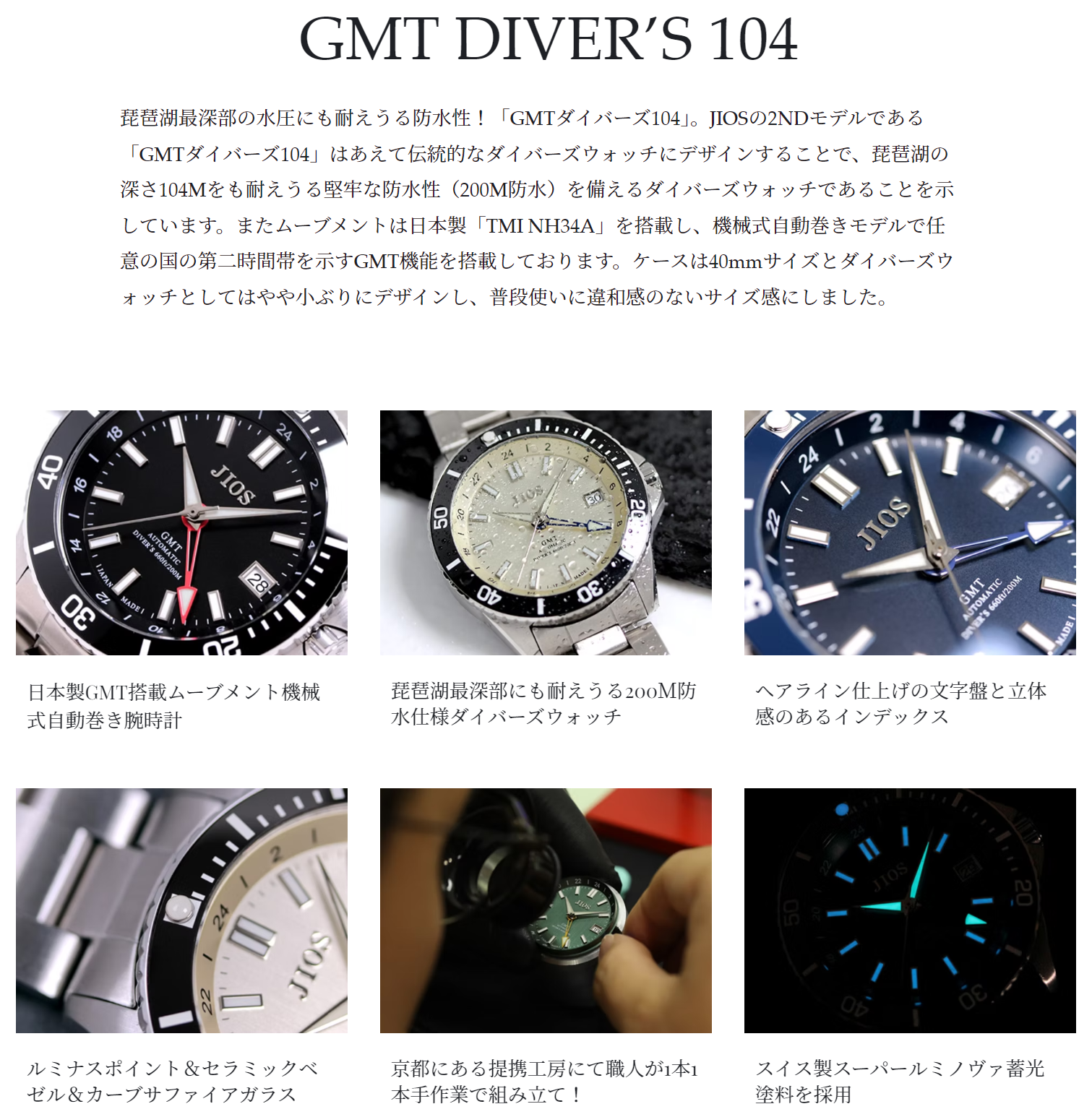 GMT DIVER’S 104はその名のとおり、第二時間帯を表示できるGMT(Greenwich Mean Time:グリニッジ標準時)機能を持たせたダイバーズウオッチです。104は琵琶湖最深部の約104mの意味で、その深さに耐える200m防水とのこと。