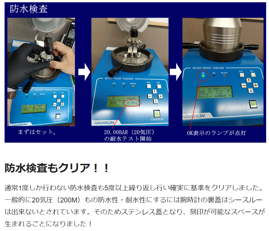 JIOS GMTダイバーズ104は、いたるところで200m防水の謳い文句が見られます。文字盤にもDIVER’S 660ft/200Mという表示があり、またmakuakeサイトでも、このように防水検査を行いクリアしていることがアピールされています。