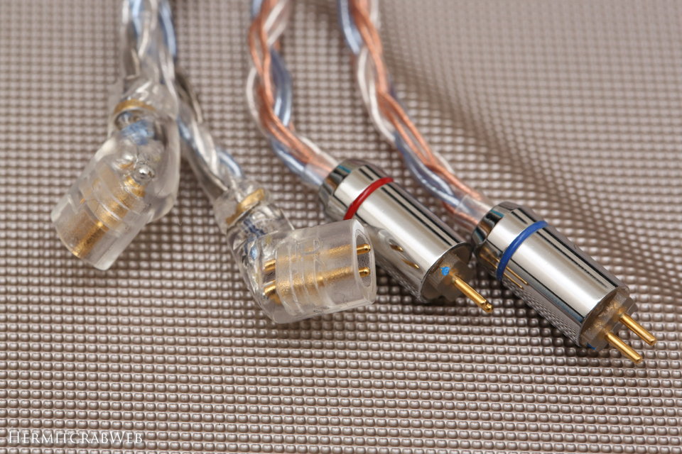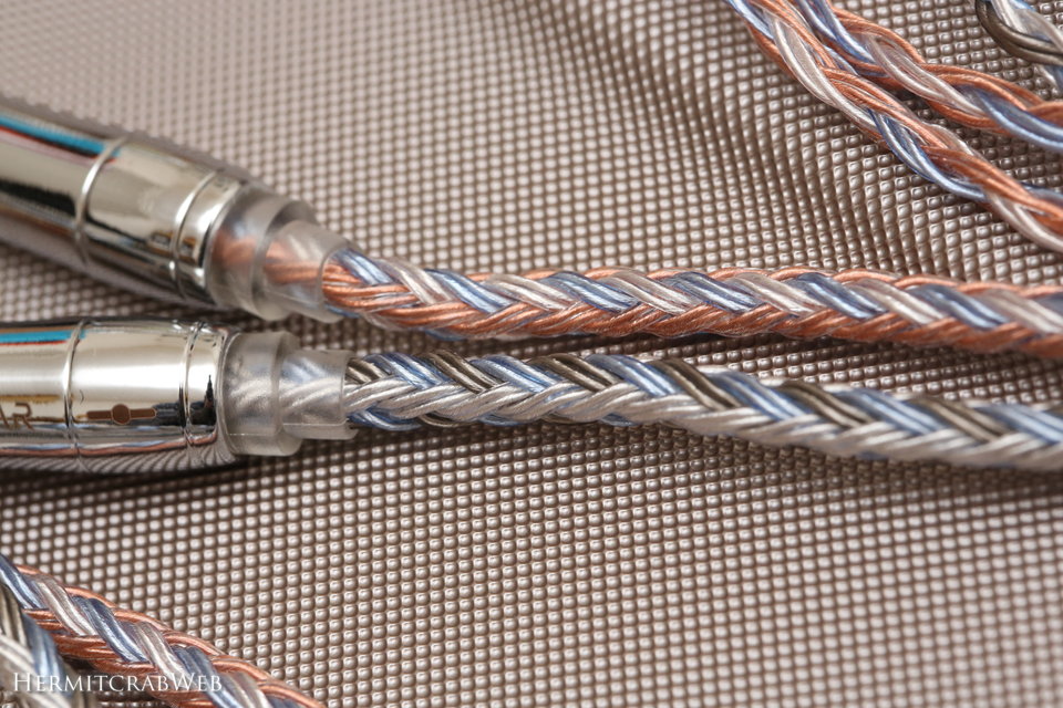 いずれも16芯の銀メッキ銅線ケーブルでプラグは3.5mm仕様。右はピンク、ブルー、シルバーが2:1:1で配分されており、コネクタは中華2ピン仕様です。左はシルバー、ブルー、グレーが2:1:1で配分されており、コネクタはqdc仕様です。