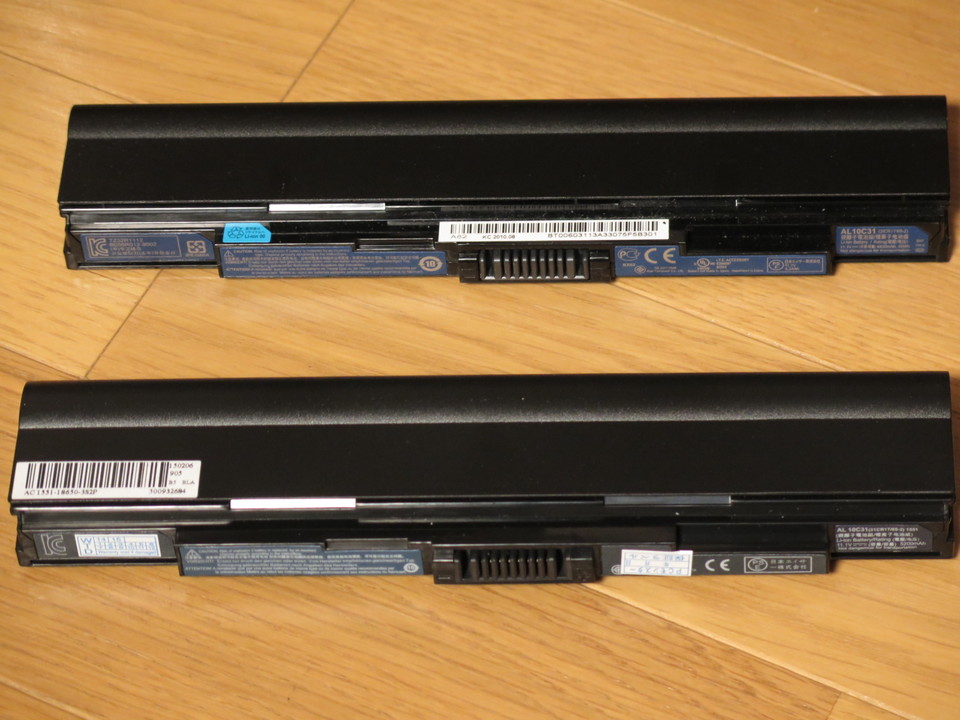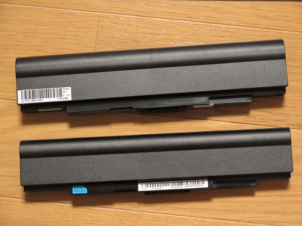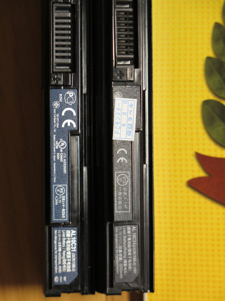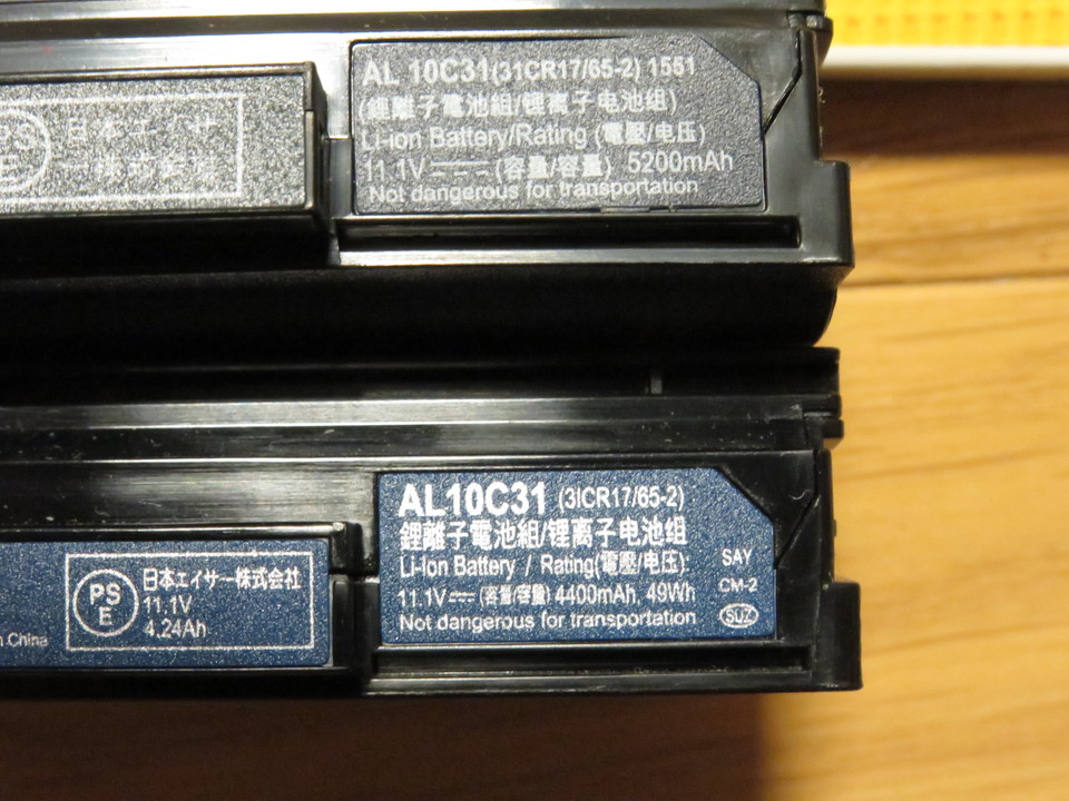 新しいバッテリーの型番はAL10D56のはずですが、なんとAL10C31になっていますね。電圧は11.1Vで両方同じですが、新しい方は容量が5,200mAhで純正より800mAh増量になっています。上記サイトの著者が購入したものは5,800mAhだったようですので、それとは違うバッテリーを購入したことになったのでしょうか。なお小生が購入したものは楽天で5,900円でした。