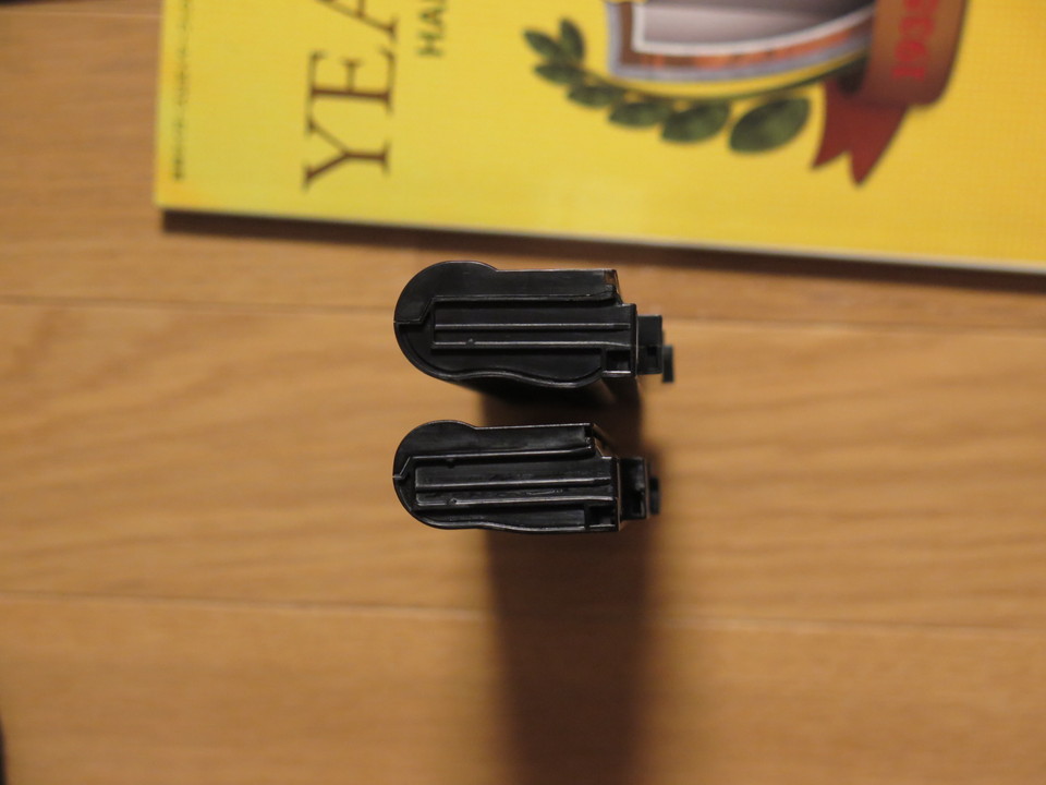 上から見てみました。上が新しいバッテリーです。接続部分とは反対側、曲線になっている部分のふくらみ?が、新しい方が大きく見えます。