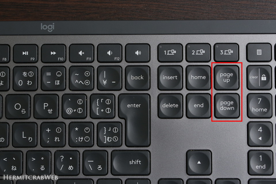 こちらは現在のメインキーボードであるLogicool MX KEYS。好きすぎて自宅とオフィスに1台ずつ置いているお気に入りのキーボードなのですけど、テンキー部分の左側にPgUp/PgDnキーがあります。