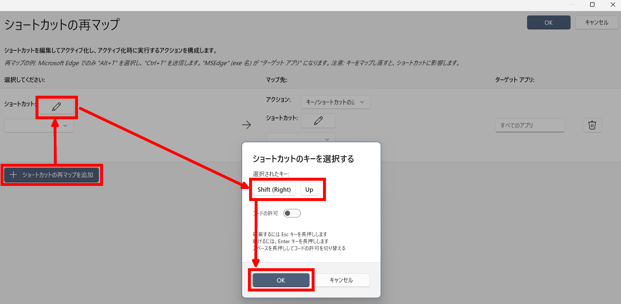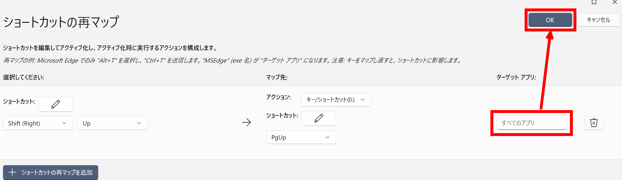 まずはショートカットキーの設定です。ショートカットの再マップを追加→鉛筆アイコンをクリックでショートカットキーを選択するウインドウが出るので、ショートカットキーを押してウインドウに表示させ、OKをクリック。ここではPgUpのショートカットを作りたいので、右側のShiftキーを押しながら上矢印を押すショートカットを設定することにします。