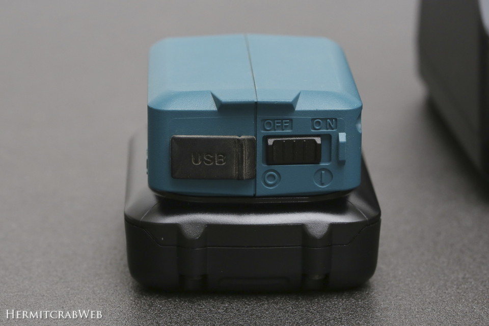 ちょっと汚れていますがご勘弁ください。USBポートには防水、防塵のためのフタがあります。モバイルバッテリーではまず見かけない動作スイッチがついているのもマキタならでは。