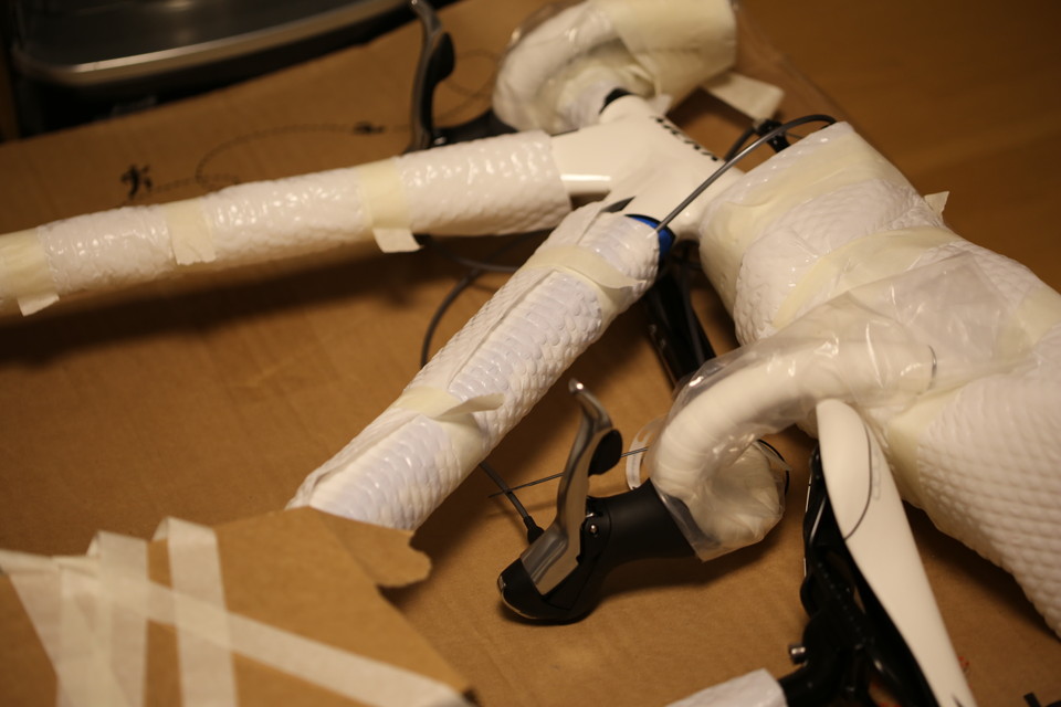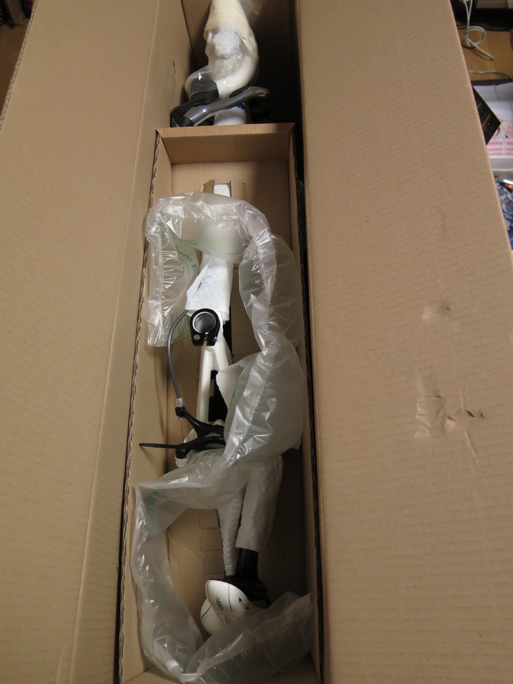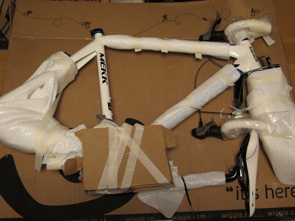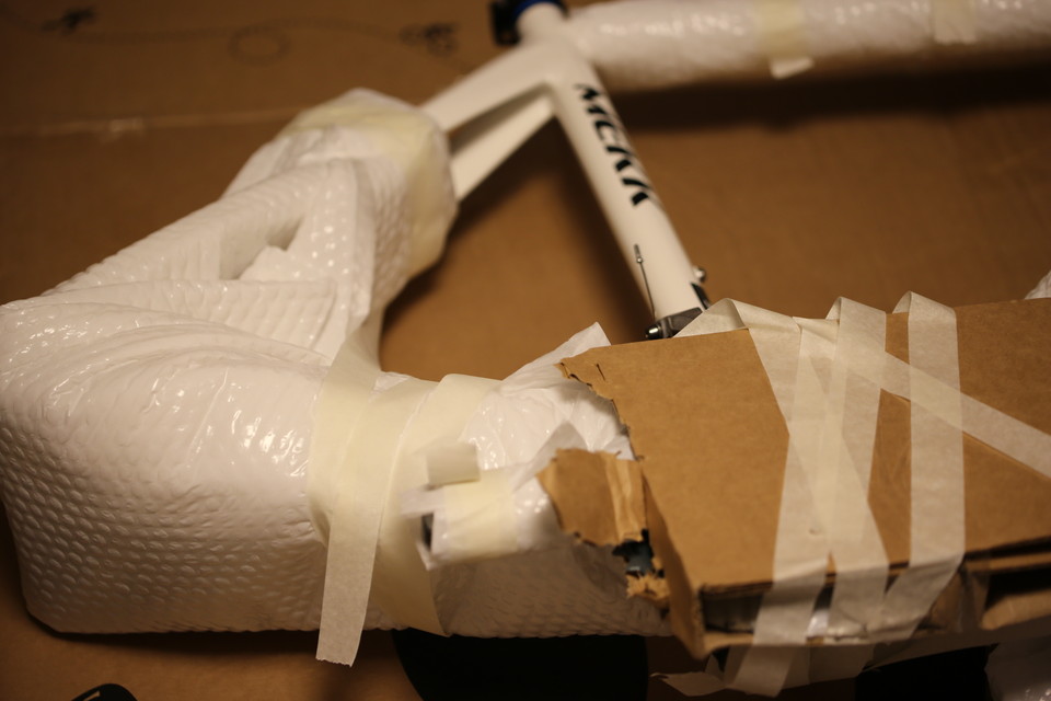 フレームを取り出しました。写真右が前、左が後ろです。各部が緩衝材で厳重に保護されていますね。変速周りはダンボールも活用して更に厳重に守られています。ハンドルは、前フォークにからみつけるように固定されていました。ブレーキやシフトのワイヤーはハンドルに接続されているので、ハンドルをフレームから離すことができません。なのでこういう風に梱包されているのですね。