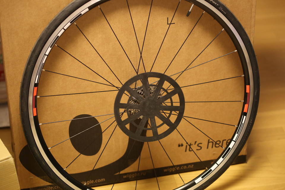 リアホイールを取り出しました。ハブに付いているのがプラスチックの保護材です。リムに書いてあるR500の文字、シールなので剥がしてしまうかもしれません。