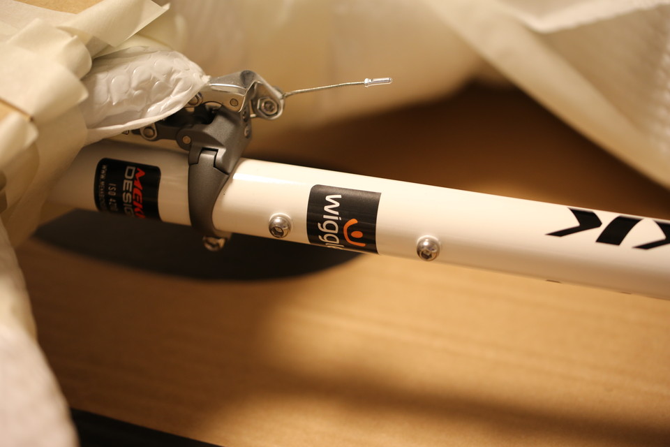 見て分かるとおり、ケーブルは接続されています。wiggleのサービスとして、出荷前に一度ユーザーの体格に合わせて調整したのち、ハンドルやホイールなどを外して梱包しているとのことですので、各部のケーブルは接続されたままです。おかげで、最小限の組み立てのみで一応乗れるようになるわけですね。