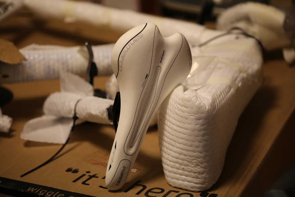 サドルはこんな感じ。白くてかっこいいね。ストゥーム・トルーパーみたい。硬さはまあまあ。若草号と同じくらいの硬さかな。