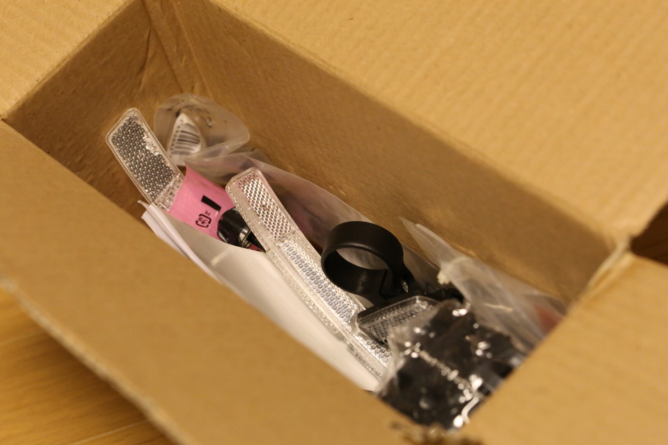 中にはこれらが入っていました。組立工具としてペダルレンチとマルチツール、フラットペダル(これは製品の仕様にペダル付属と書いてありました)、前後のクイックリリース(ホイールをフレームに取り付けるパーツです)、前後とホイールに付ける反射材、MEKKのユーザーマニュアル。下のゴム製のパーツ2個は何なのでしょう・・?パーツに「Anatomic Bar Only」との刻印があるのでハンドルまわりのパーツのようですが・・・今後調べてみます。保安部品として、ベル(警音器)を別途購入し取り付ける必要がありますね。