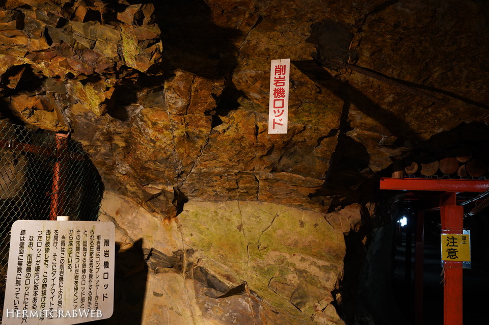 削岩機ロッド跡。天井にロッドがささったまま残されています。