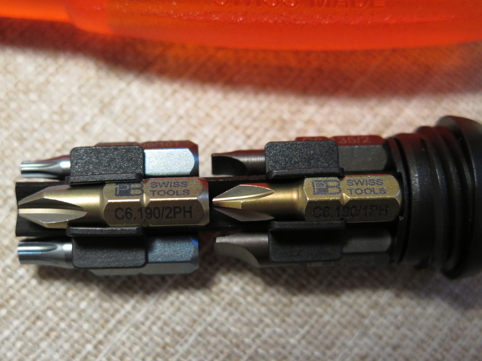ビットのはまる部分のドアップを撮っていたら面白いことに気づきました。六角形の穴のふちが、直線ではなく波打っています。PBに限って精度が悪いなんて事はないはず・・・たぶん差し込むビットがトルクをかけたときに面接触するように設計されているのでしょう。PBのサイトに書いてないかな?後で探してみようっと。