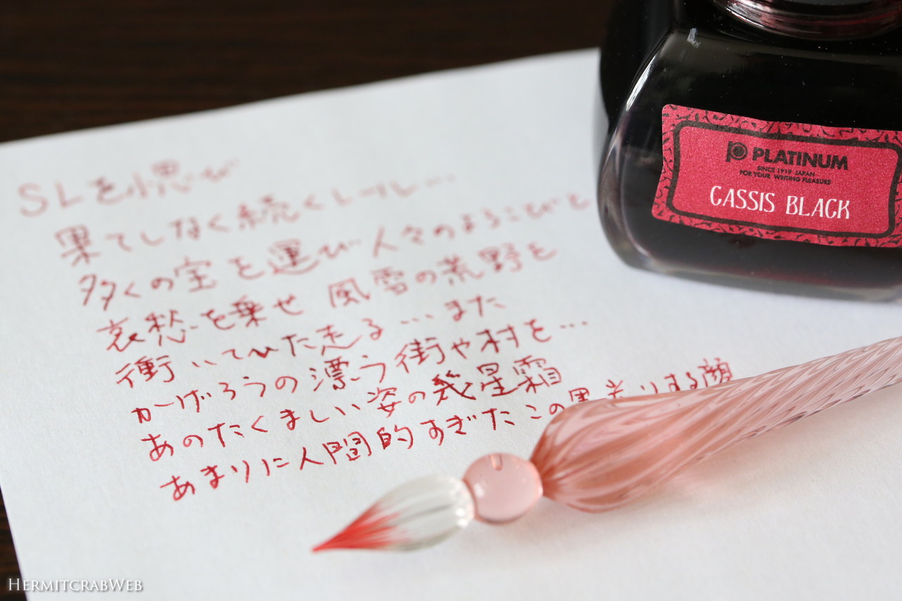 PLATINUM(プラチナ万年筆)カシスブラックはいわゆる古典インクです。古典インクは一般的な染料インクより耐水性が高いと言われています。