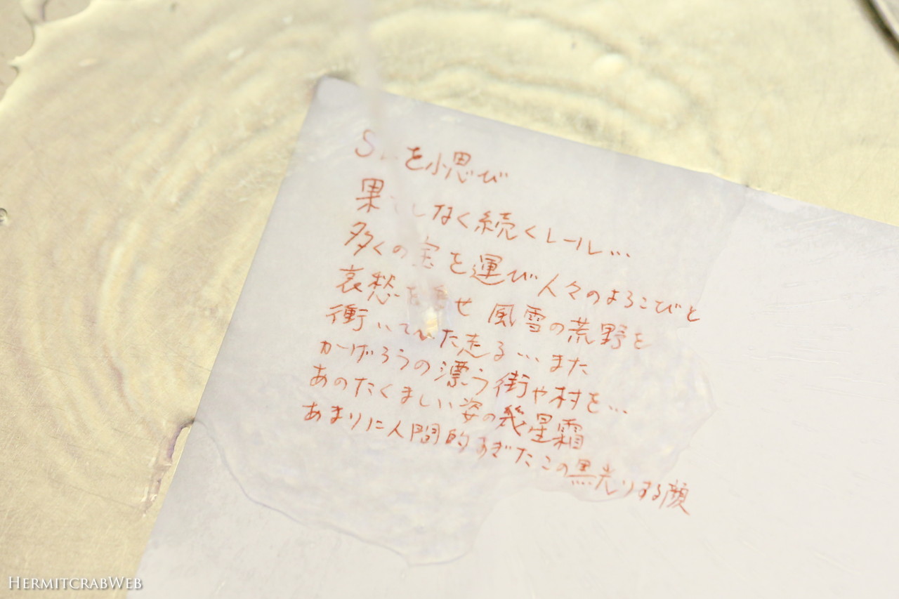 ガラスペンで書いた原稿を数日乾燥させ、思い切って流水にさらしました。