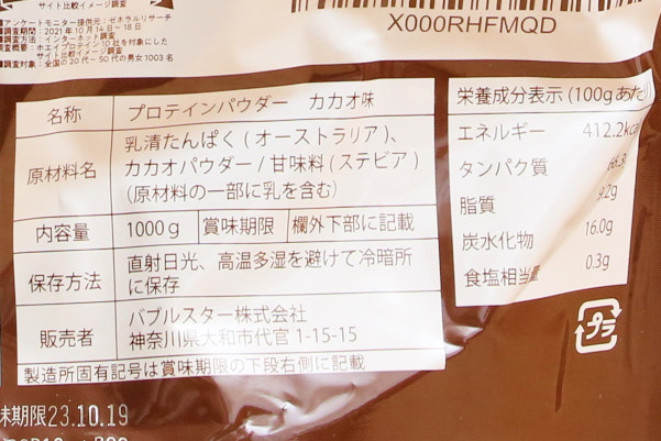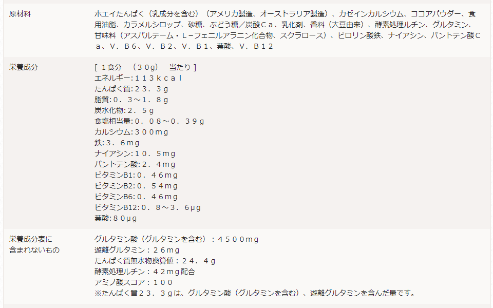 なるほど、原材料は①乳清たんぱく②カカオパウダー③ステビアの3つだけのようです。これらを入れていることは、確かにサイトに載っていましたね。これ以外の添加物は入れていないので、原材料をあえてサイトにリストアップする必要はない、という考え方のようです。