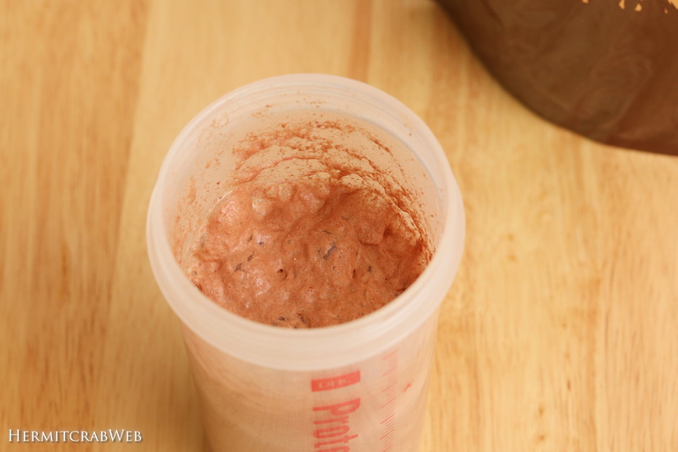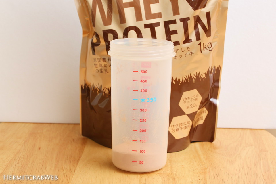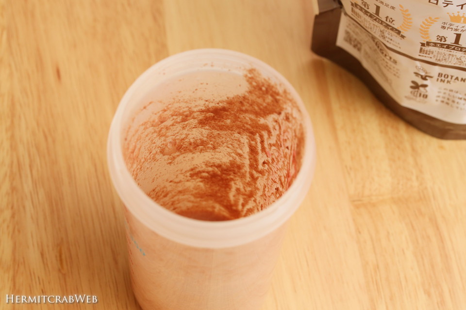 シェイカーの周りにプロテインが残ってしまったので、少量の水を追加して共洗いし飲み切りました。