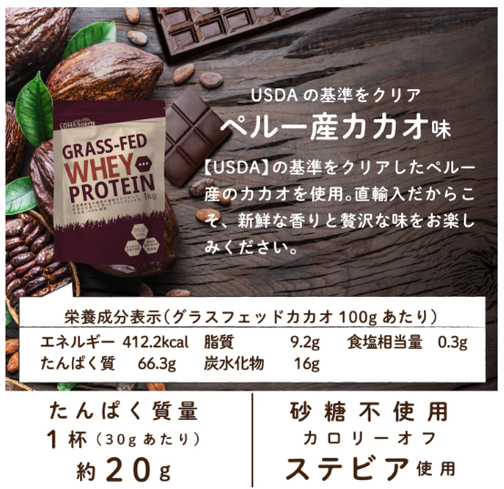 カカオ味:アメリカオーガニック認証【USDA】を取得したペルー産の香り高いカカオを使用。天然由来の贅沢なチョコレート味。