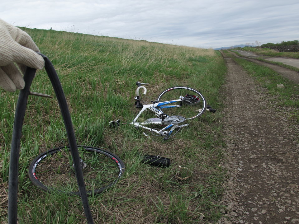 サイクリングロードを北上すること約12km、このあたりから先は冬期間雪捨場になっており、雪は全て解けているものの路面に泥や小石が散乱して危険な地帯になっていました。泥道に突っ込んで車輪がドロドロになったりして嫌な予感がしていたところ、ガン!!という大きな音が。見えなかったのだけどどうやら石に乗り上げてしまったみたい。停まって様子を見てみると、後輪からシュー!!と盛大な音が!