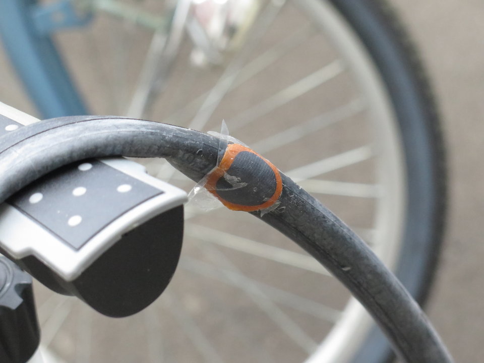 修理に30分以上かかってしまいましたが、なんとか復旧。修理内容は、後輪を取り外し、穴の開いたチューブを取り出し、新しいチューブを取り付け、空気を入れてフレームにとりつける、という流れです。穴の開いたチューブは持ち帰ってから修理します。