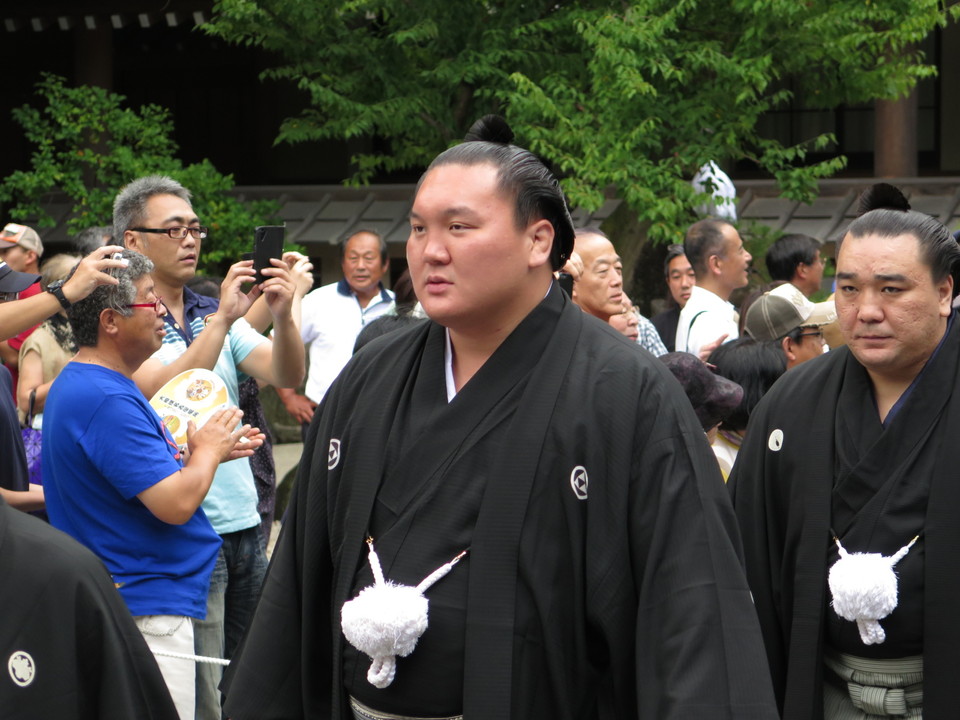 そのうち、タクシーでぞくぞくと力士が到着。奉納土俵入りということで、横綱・大関、そして露払い・太刀持ちの関取たちがやってきました。