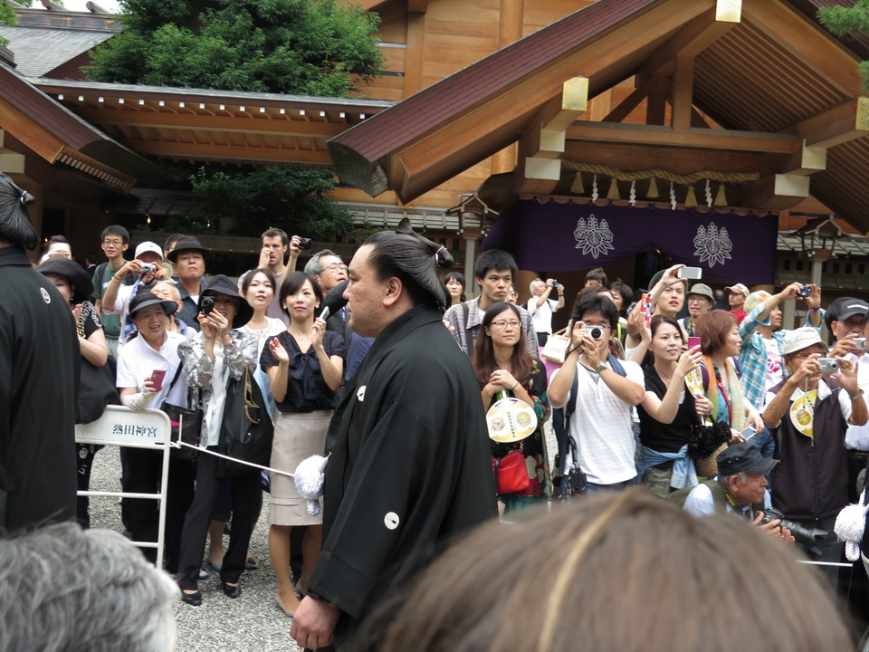 名鉄名古屋駅から神宮敷地内に入っていくと、社務所付近に大勢の人だかりが。誰か芸能人でも来ているのかと思ったら、浴衣姿のお相撲さんがちらほら。人だかりの持っているうちわには「大相撲名古屋場所」の文字が。耳に入ってくる雑談を総合してみると、どうやらこれから奉納土俵入りがあるらしい。そういえば7月といえば名古屋場所。そうです。偶然にも熱田神宮の奉納土俵入りに出くわしたわけです。