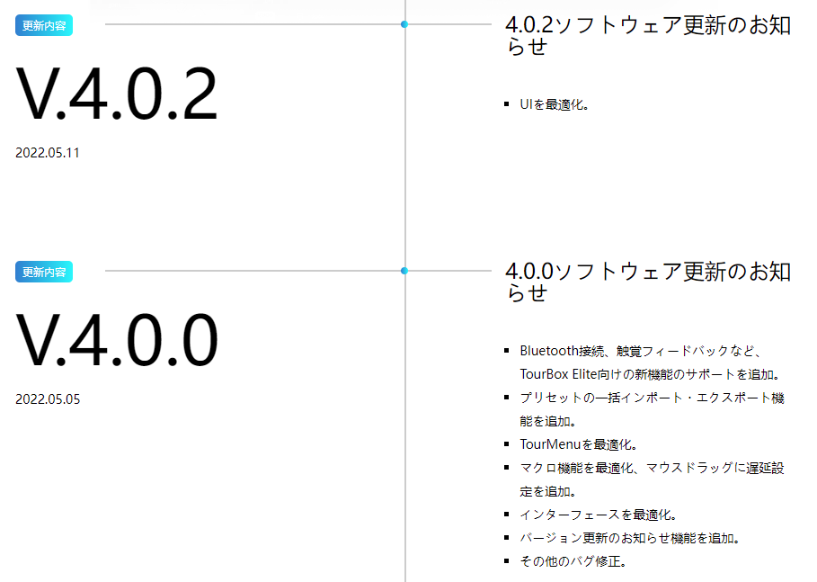 V4.0.0で待望のElite対応となったTourBox Consoleですが、V4.0.0リリース以降はバグ修正のみのアップデートでした。