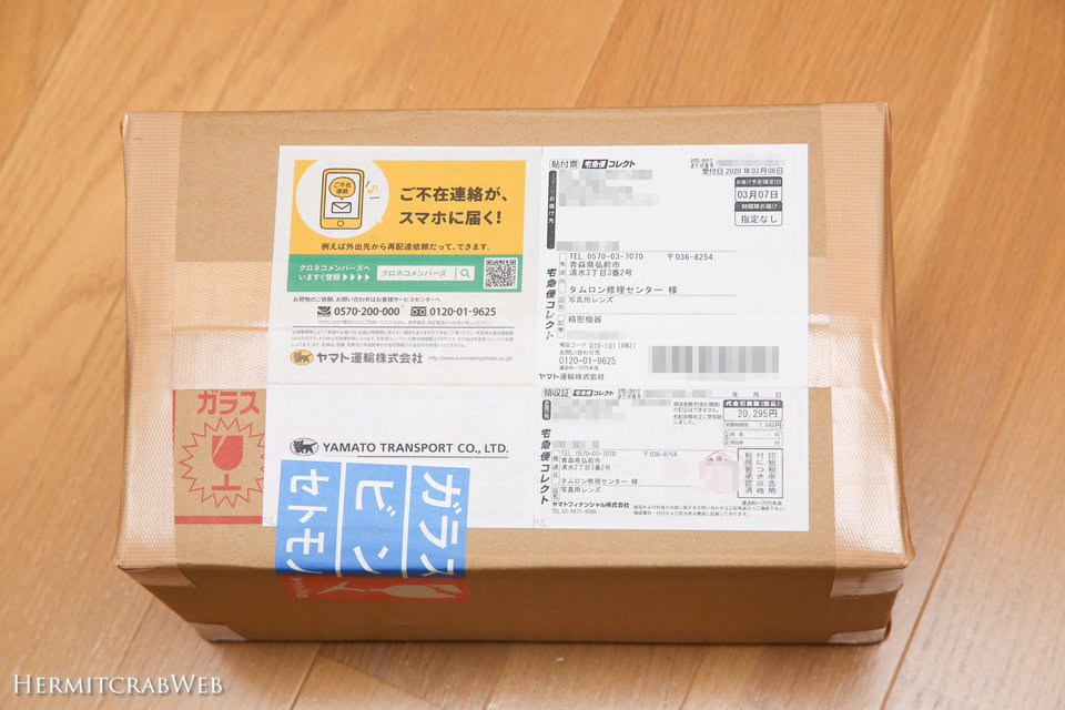 レンズが帰ってきました!発送してから10日後というスピード到着です。料金着払いで対面で受け取る必要がありますので、ヤマトのドライバーさんに料金を払って受け取りました。