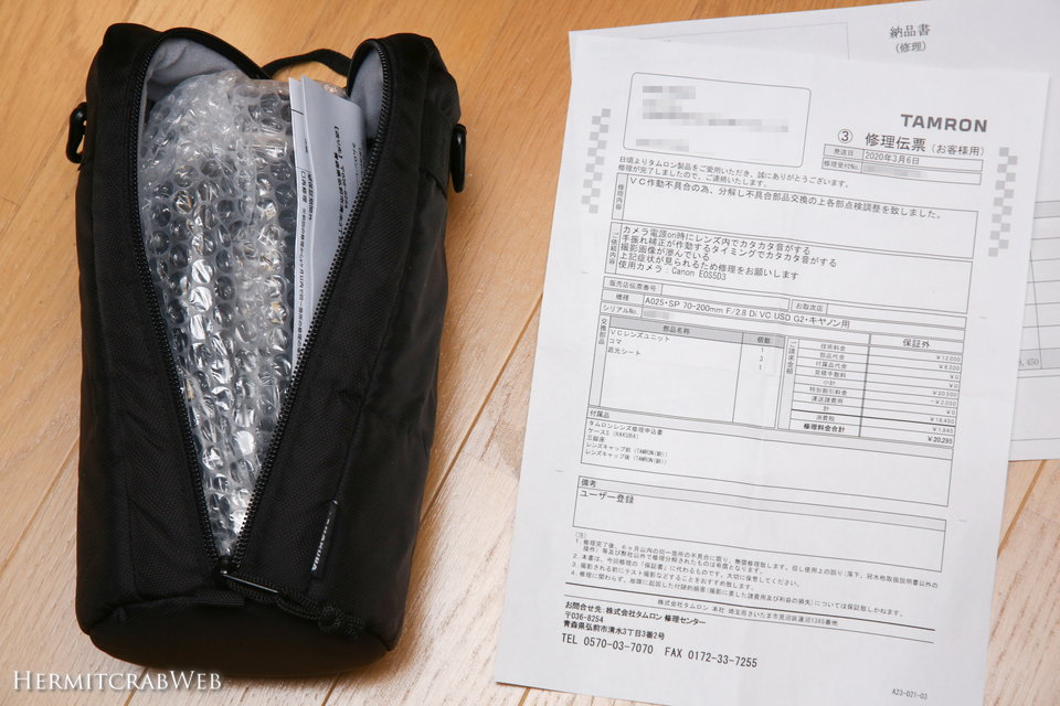 レンズは小生のソフトケースの中に、さらにプチプチに包まれていました。厳重ですね。一緒に、修理伝票と納品書も入っていました。