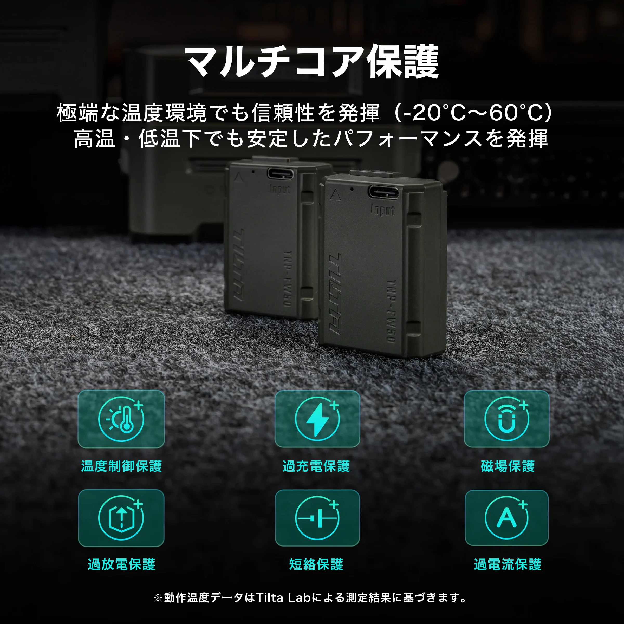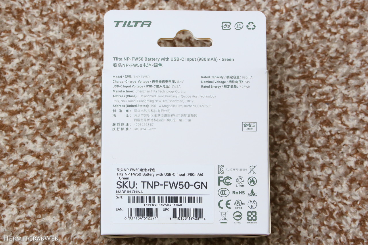 α5100の純正バッテリーはNP-FW50ですが、TILTA TNP-FW50はその互換バッテリーです。ご覧のとおり、バッテリー自体にUSB Type-C差込口があることが特徴です。またちょっとアースカラーっぽいカラーリングも文字どおり異色です。