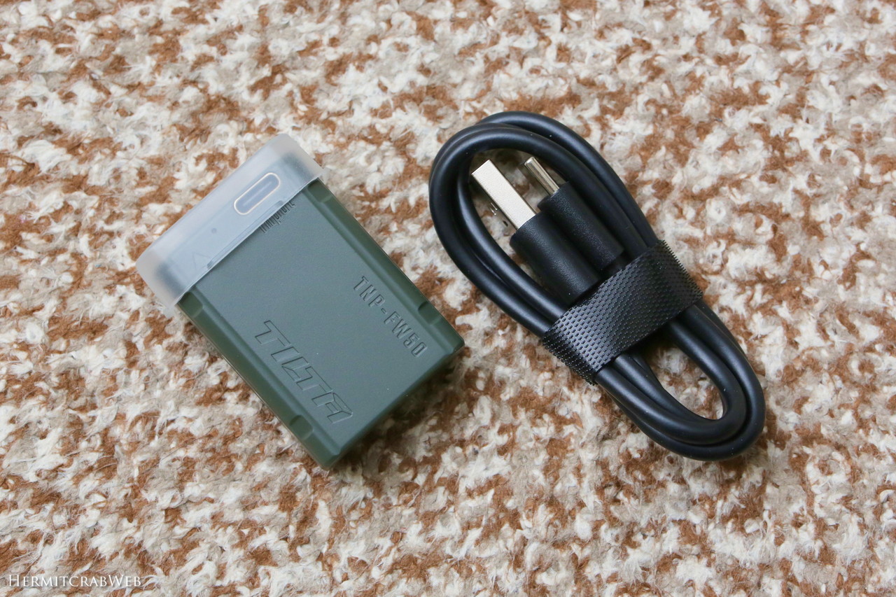 表面にはエンボスでTNP-FW50とTILTAの表記があります。上部(写真左側)にはUSB Type-Cと充電状態を示すLEDがあります。