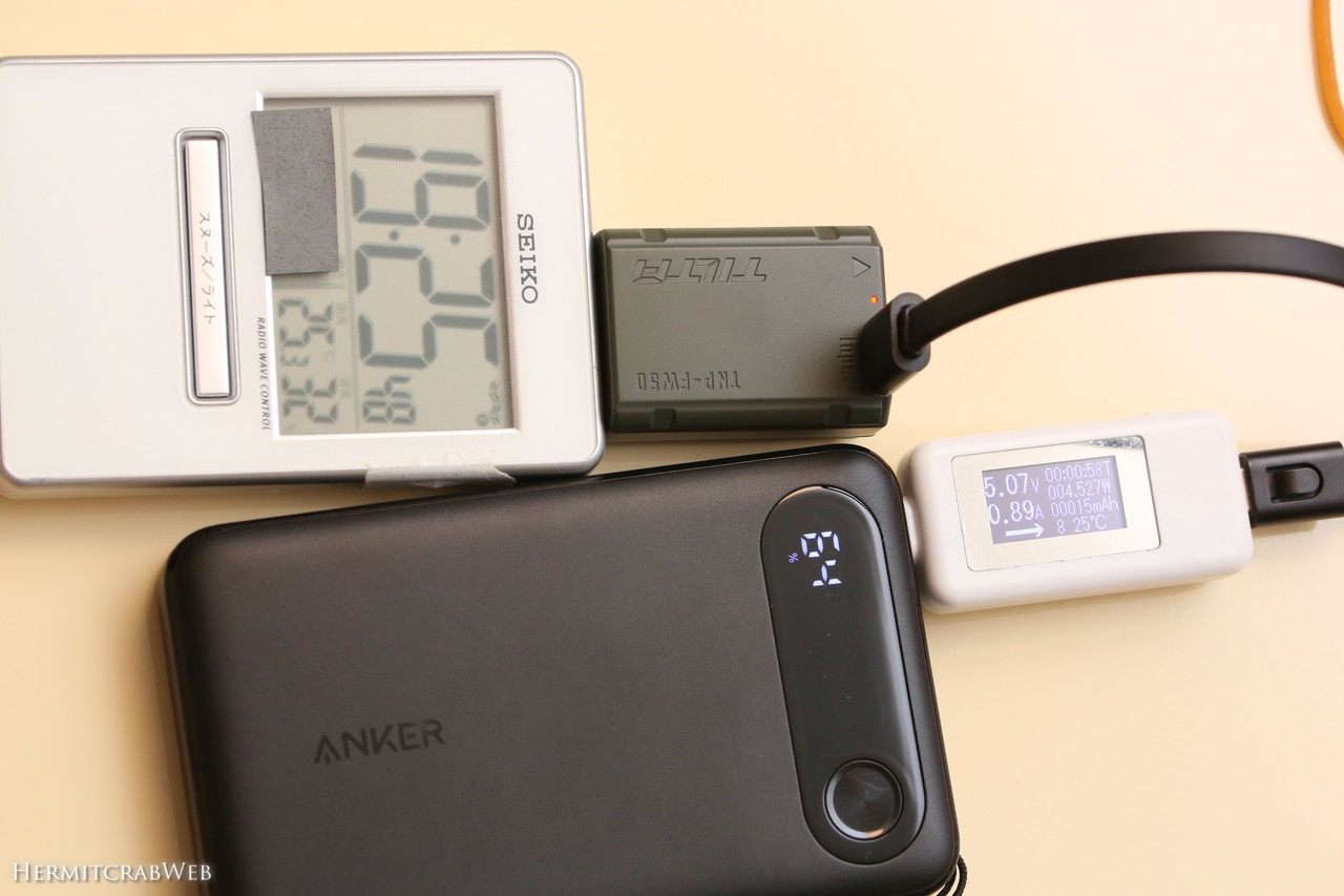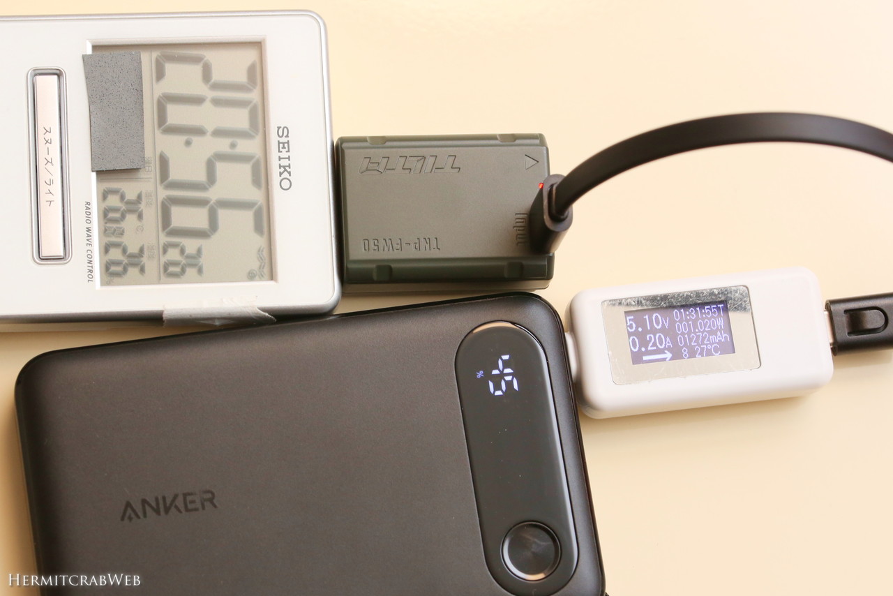 このモバイルバッテリー(Anker Power bank 10,000mAh, 22.5W A1257)目線だと残量64%→45%に下がっていましたので、約20%の容量を使って満充電できる、という指標も得られました。10,000mAhの20%は2,000mAhじゃないか、計算が合わない!とおっしゃる方もいるかも知れませんが、バッテリーの充放電時にはロスが生じるほか、何Vで算出しているかによっても数値は変わってきます。