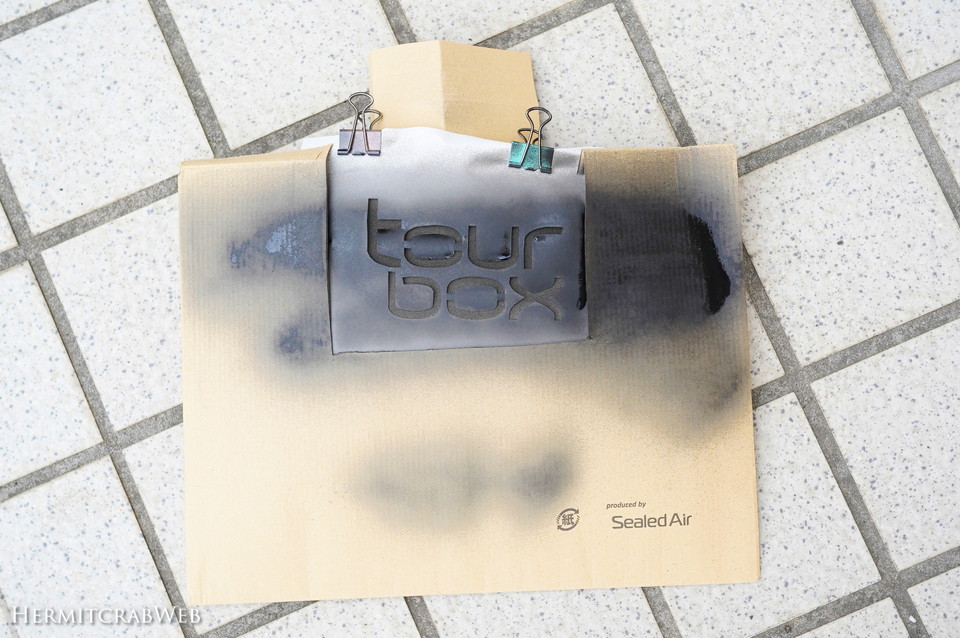型紙の周りに塗料がつかないように養生します。通販でよく届く封筒にこんな感じで切込みを入れて、