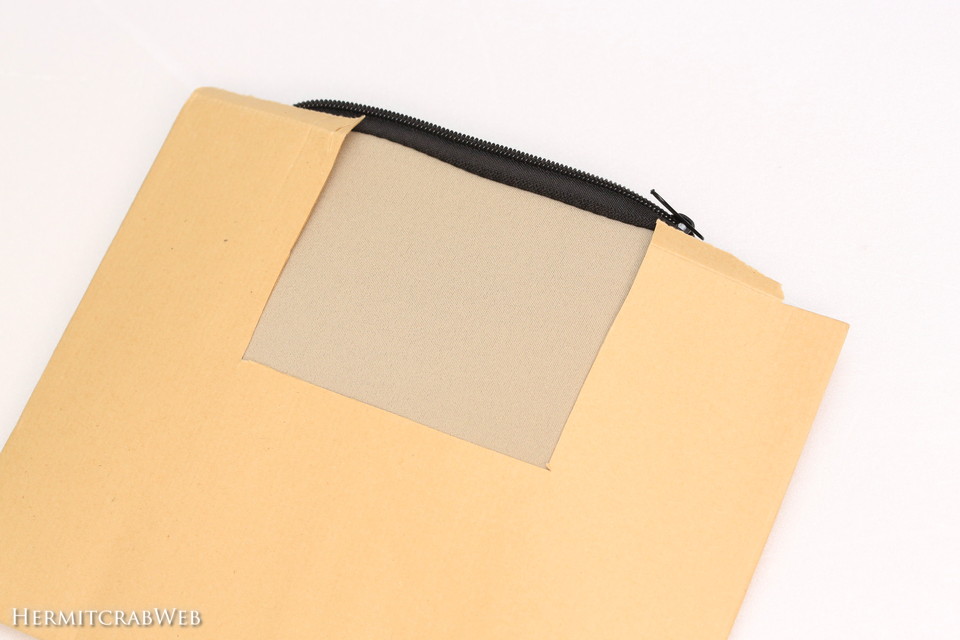 ケース、型紙、封筒を固定します。型紙とケースとの間は密着していた方が良い結果になりますが、まあそのへんはお好みで。ずくなしの小生は、ケース内部に緩衝材を詰めてちょっと密着させる程度でいいか、ということにしました。