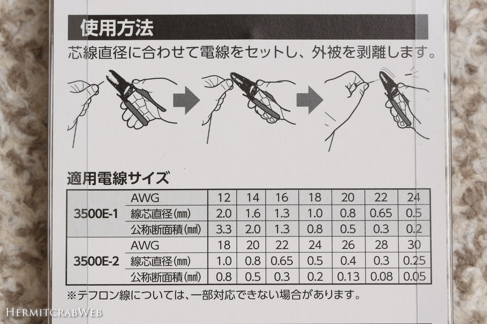 このサイズのワイヤーストリッパーには、加工できるワイヤーサイズが異なる2種類が展開されています。小生は加工可能サイズの若干大きい3500E-1(表上段)を選びました。