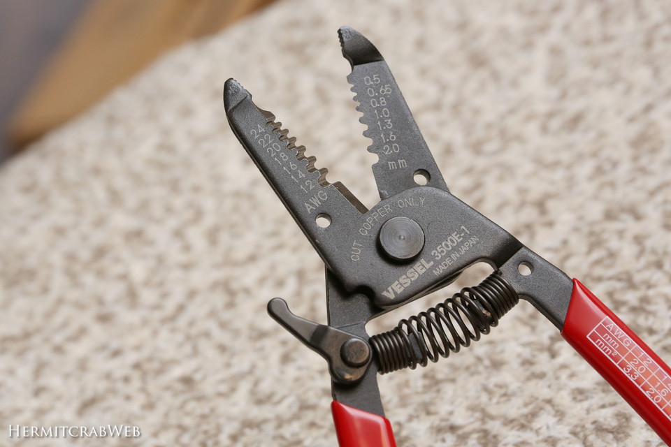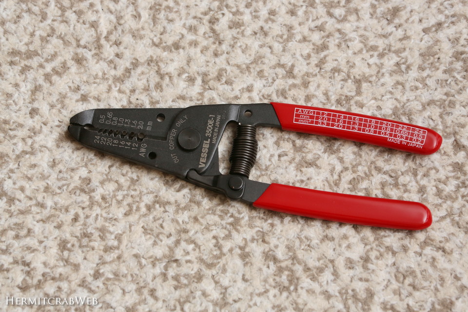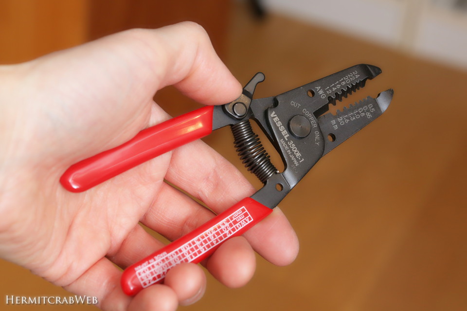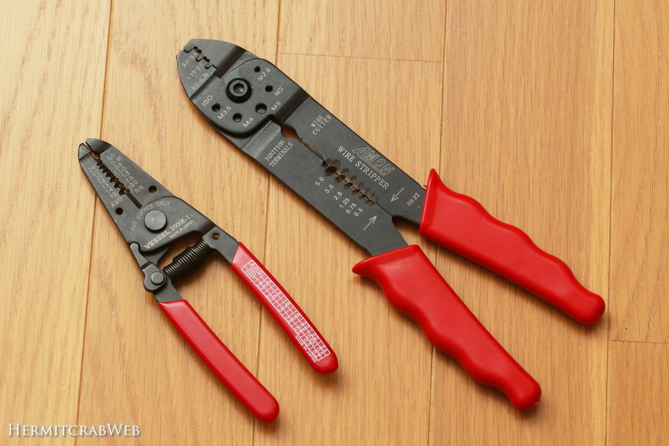 実は今まで、こんなに巨大なワイヤーストリッパーを使っていました。クルマの電気設備を加工するために随分前に購入したものです。ワイヤー処理のほか、圧着端子をカシメることもできるのですが、サイズが大きい上にざっくりとした精度なので、細かいケーブルの処理にはとても使いにくかったのです。