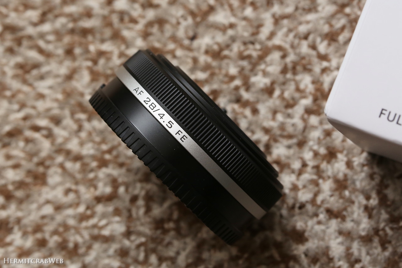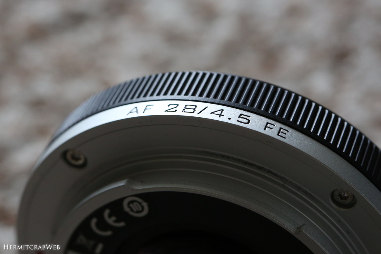 レンズ上部のAF 28/4.5 FEの文字も美しい!ちなみにFEはFull size E-mountの略で、ソニーEマウントフルサイズ機対応レンズであることを表します。