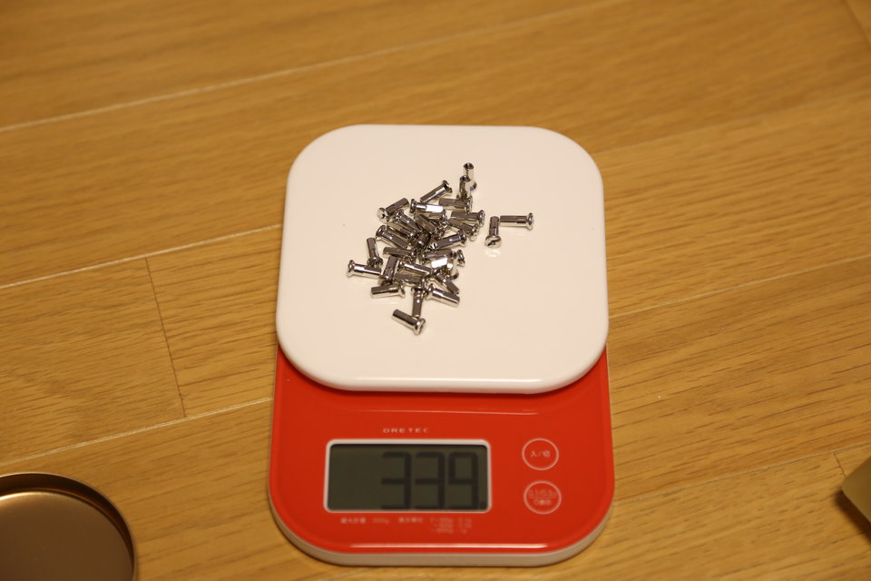 ニップルはたぶんスポークと同じくステンレス製。32個で約34g。