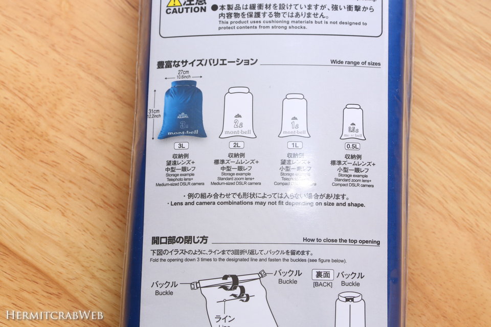 裏面表示はこんな感じ。サイズは27cm×31cmです。2リットルタイプは23cm×25cmですので、3リットルタイプは縦横ともに一回り大きいですね。収納例は、望遠レンズ+中型一眼レフ、とのことです。