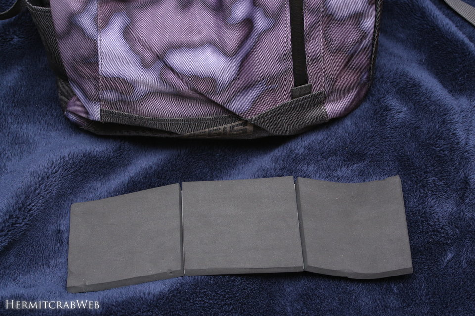 リュック自体のクッション性能は貧弱なので、底面に縦横10cm、厚さ1cmのウレタンスポンジを3枚つないだものを敷いておきました。これで、地面に置いたときの衝撃を多少防いでくれます。