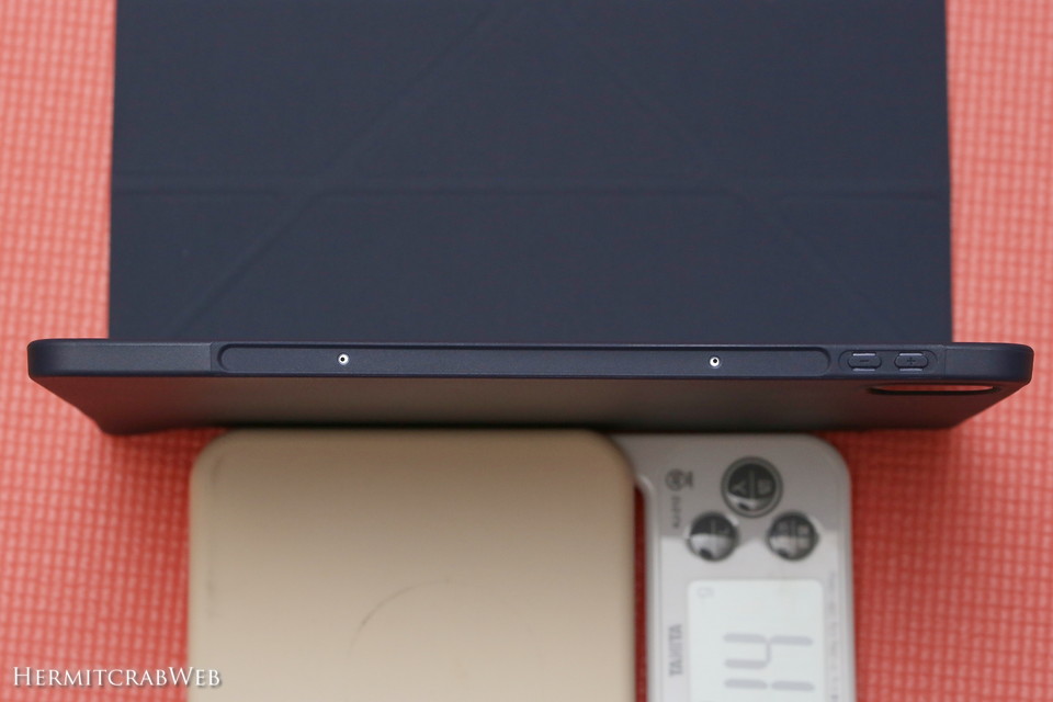 Xiaomi Pad5込みの重量は649g。このタイプのケースはシンプルで良いのですが、一方で画面の保護はしてくれないので、その点での不安があったりします。