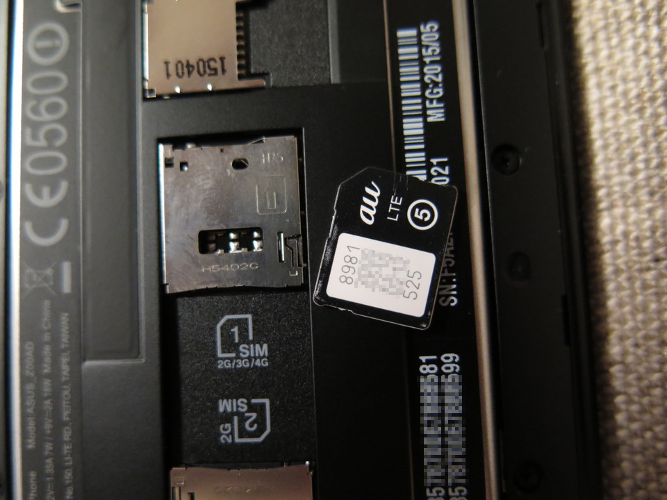 この機種はSIMカードを2つ挿して運用することができるのですが、2Gは日本ではもう使用されていない規格ですので、実質的には4G(LTE)または3GのSIMのみです。SIMカードの大きさはmicroSIMサイズでしたので、現在使っているauスマホのSIMがそのまま使えました。