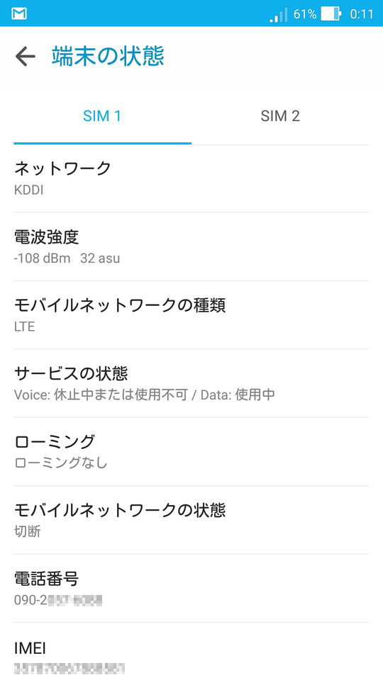 SIMを挿して電源投入。特に何も設定していなくても、KDDIのSIMでLTE対応、電話番号まで表示されています。アンテナピクト(電波強度表示アイコン)も表示されました。もしやこれでデータ通信できる!?と思いきやそうはいかず、APN設定が必要でした。